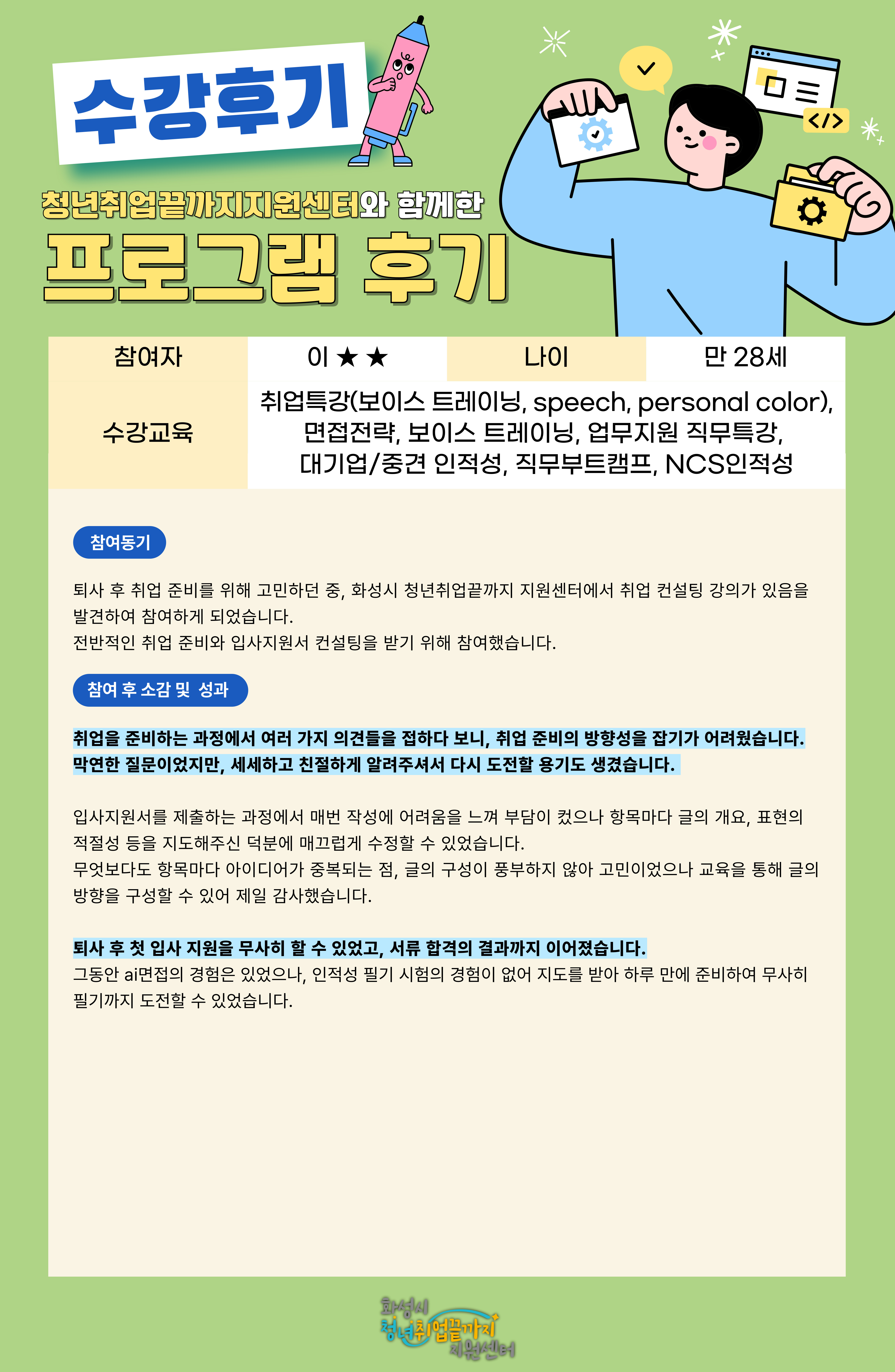 [수강후기] 화성시 청년취업끝까지 지원센터 프로그램 참여자 수강후기 (이 * * 님)
