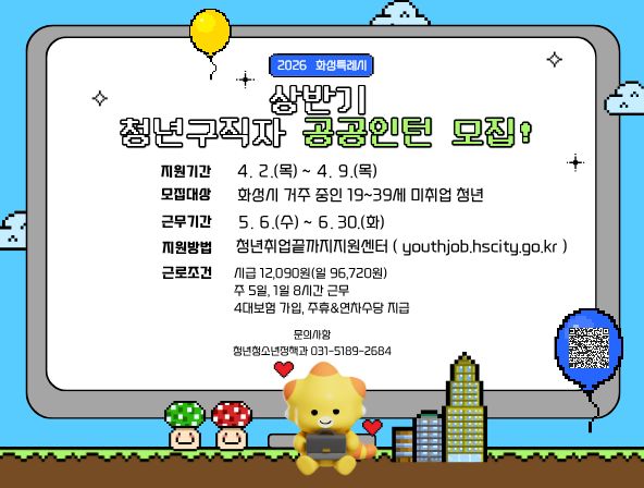 화성특례시에서『2026년 상반기 청년구직자 공공인턴』 참여자를 모집하오니 많은 관심 부탁드립니다.