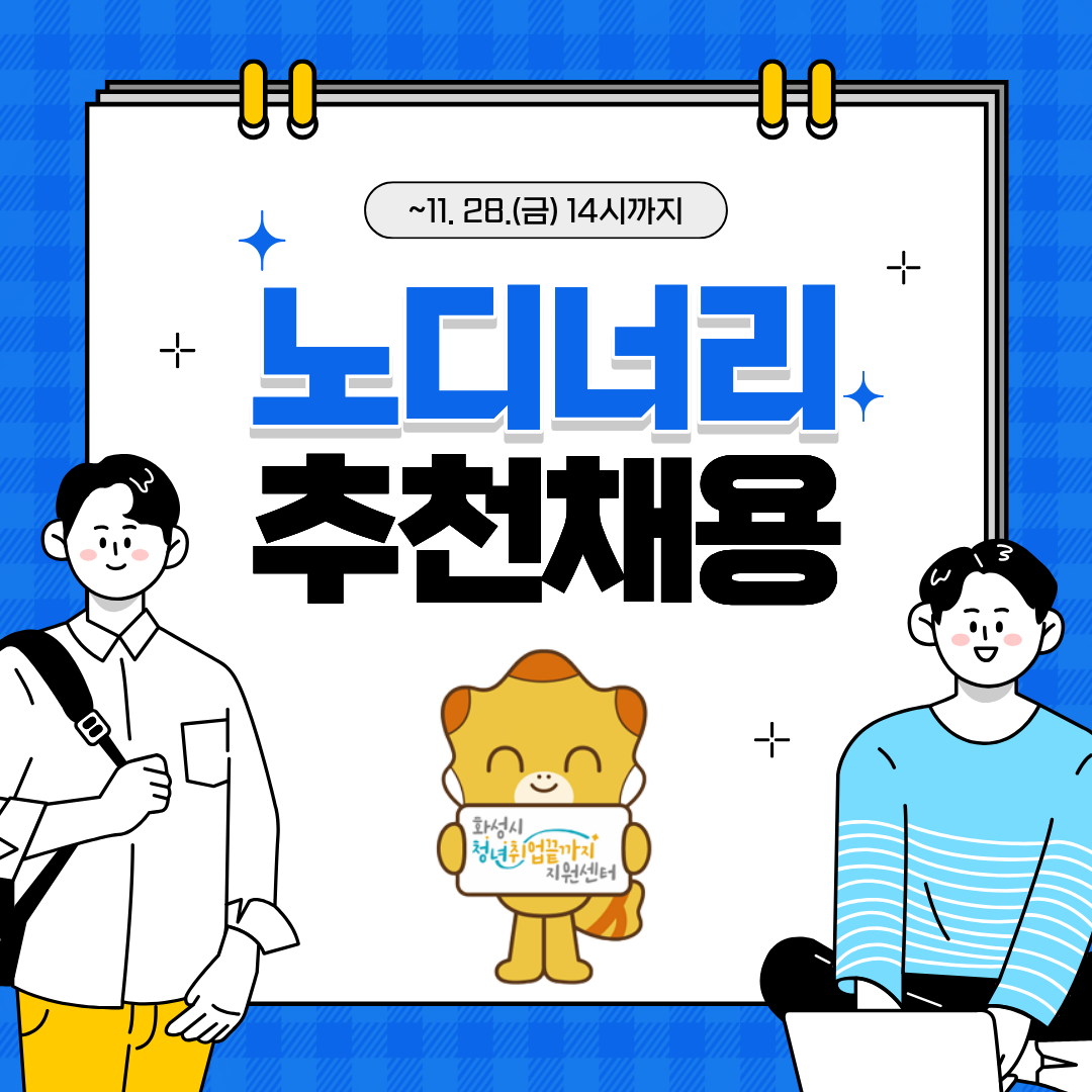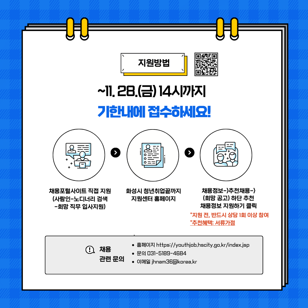 ■ 접수방법: 채용포털사이트 직접 지원(사람인-노디너리 검색-희망 직무 입사지원) -> 화성시 청년취업끝까지 지원센터 홈페이지 -> 채용정보 -> 추천채용-> (희망 공고) 하단 추천 채용정보 지원하기 클릭