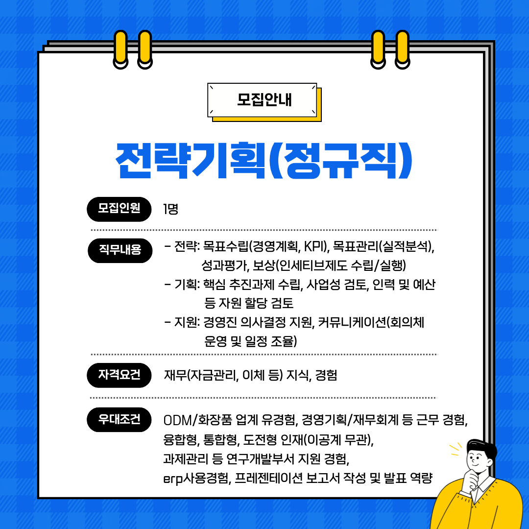 - 전략기획: 융합형, 통합형, 도전형 인재(이공계 무관), 경영기획/재무회계 등 근무 경험, 과제관리 등 연구개발부서 지원 경험, erp사용경험, 프레젠테이션 보고서 작성 및 발표 역량