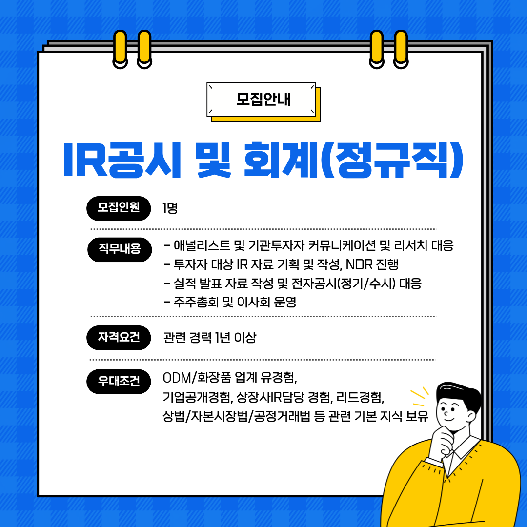 - IR공시 및 회계: 기업공개경험, 상장사IR담당 경험, 리드경험, 상법/자본시장법/공정거래법 등 관련 기본 지식 보유