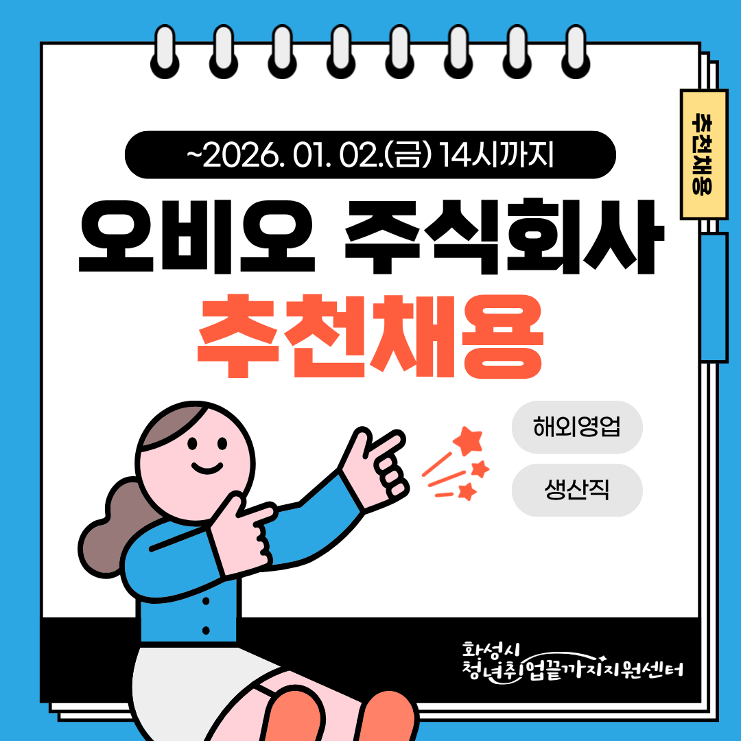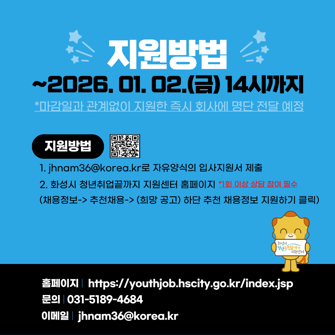 ■ 접수방법: jhnam36@korea.kr 로 이력서 및 입사지원서 제출 -> 화성시 청년취업끝까지 지원센터 홈페이지->채용정보->추천채용->(희망 공고) 하단 추천 채용정보 지원하기 클릭