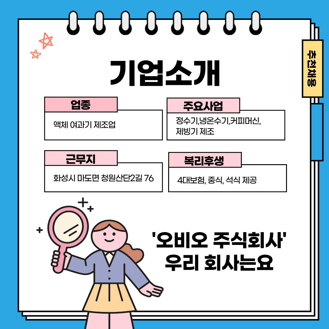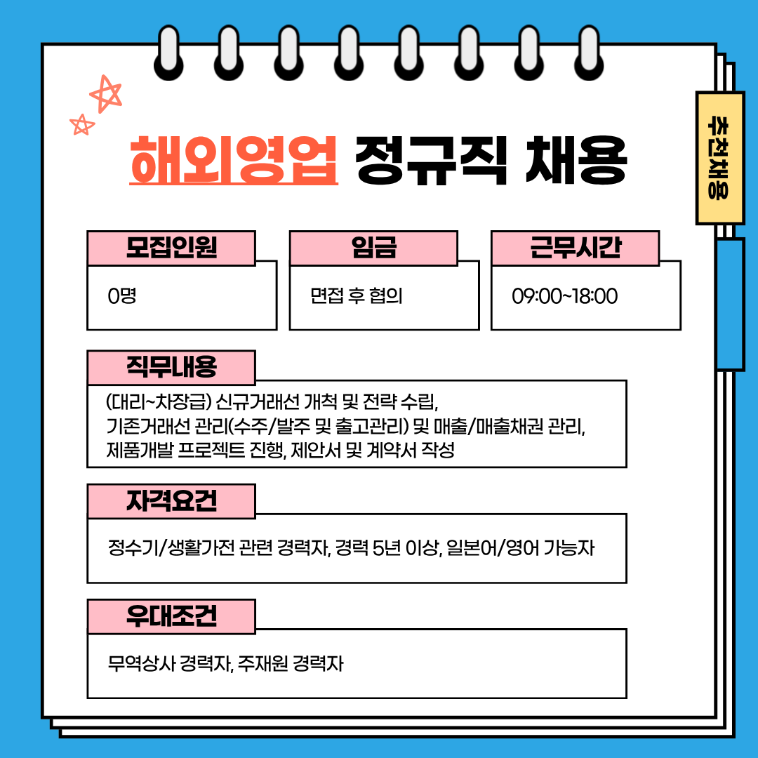 - 해외영업: 정수기/생활가전 관련 경력자, 경력 5년 이상, 일본어/영어 가능자