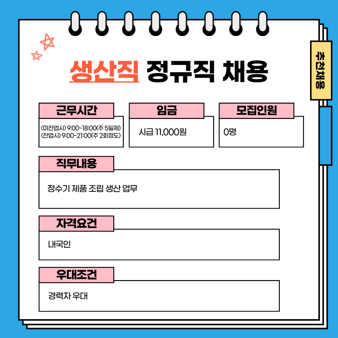 - 해외영업: 정수기/생활가전 관련 경력자, 경력 5년 이상, 일본어/영어 가능자 - 생산직: 내국인