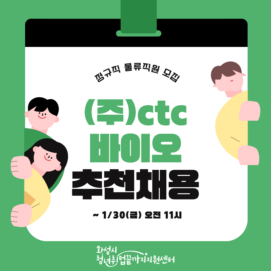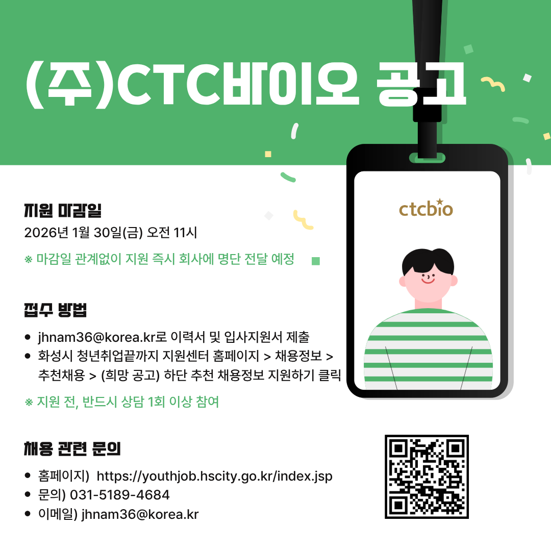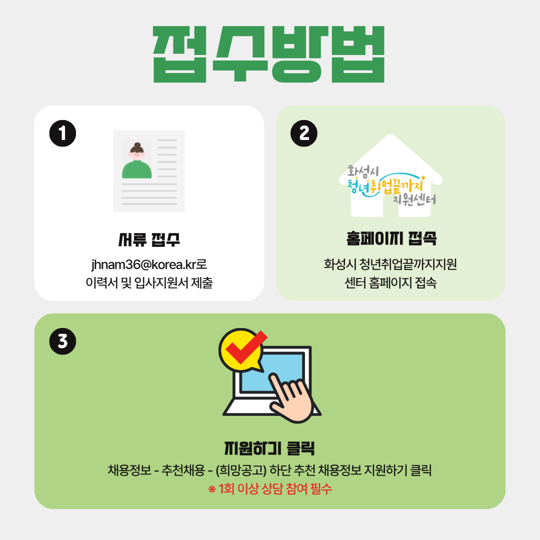 ■ 접수방법: jhnam36@korea.kr 로 이력서 및 입사지원서 제출 -> 화성시 청년취업끝까지 지원센터 홈페이지->채용정보->추천채용->(희망 공고) 하단 추천 채용정보 지원하기 클릭