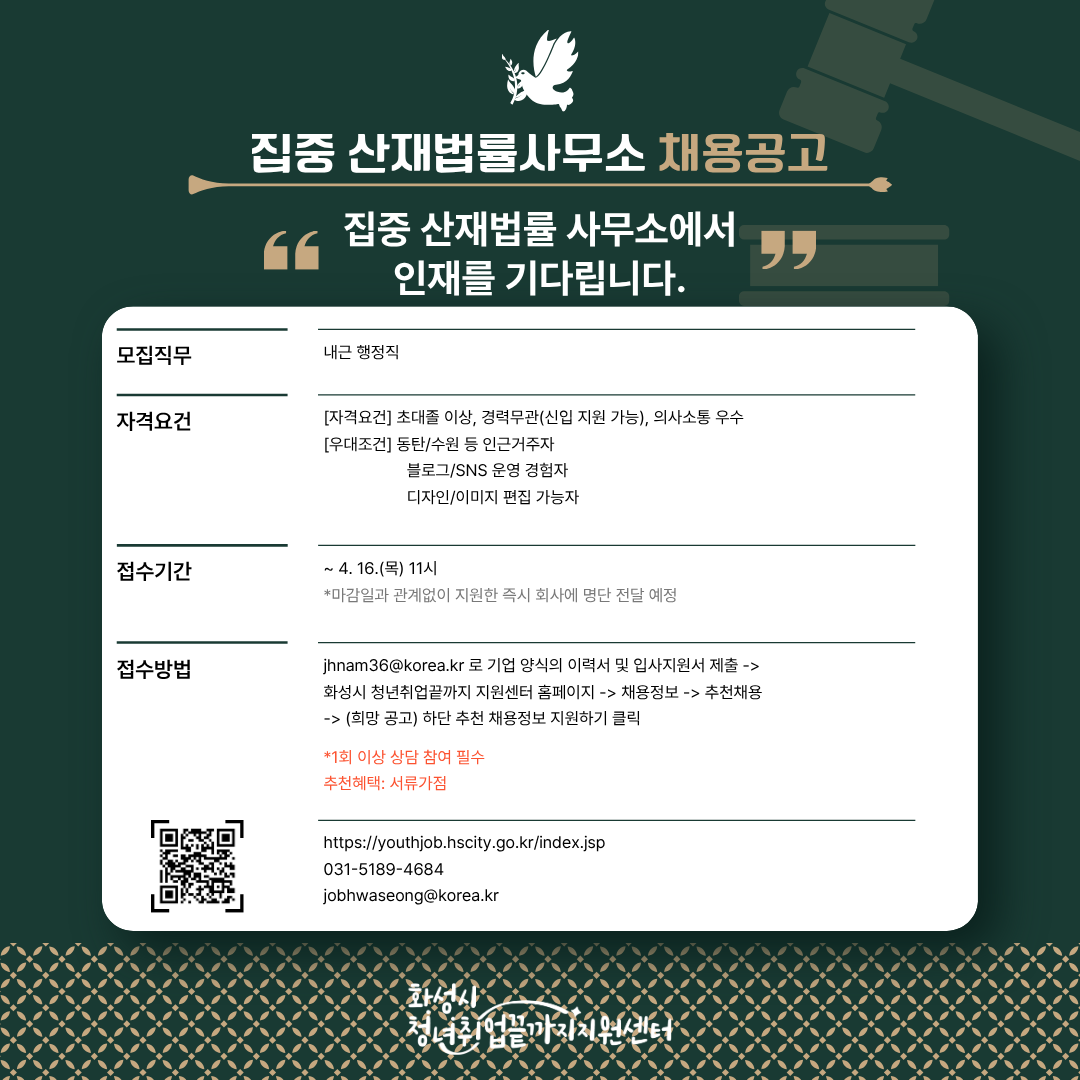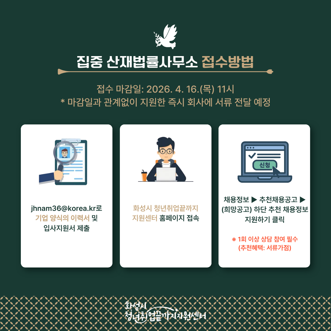 접수방법: jhnam36@korea.kr 로 기업 양식의 이력서(첨부파일 참고) 및 입사지원서 제출 -> 화성시 청년취업끝까지 지원센터 홈페이지 접속 -> 채용정보 -> 추천채용 -> (희망 공고) 하단 추천 채용정보 지원하기 클릭