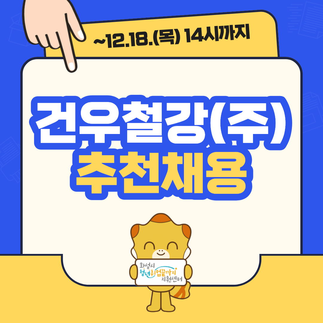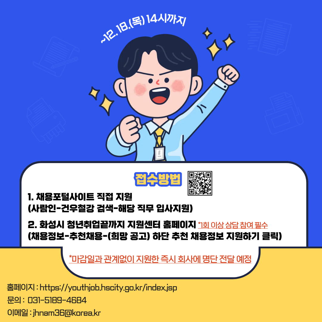 ■ 접수방법: 채용포털사이트 직접 지원(사람인-건우철강 검색-해당 직무 입사지원) -> 화성시 청년취업끝까지 지원센터 홈페이지->채용정보->추천채용->(희망 공고) 하단 추천 채용정보 지원하기 클릭