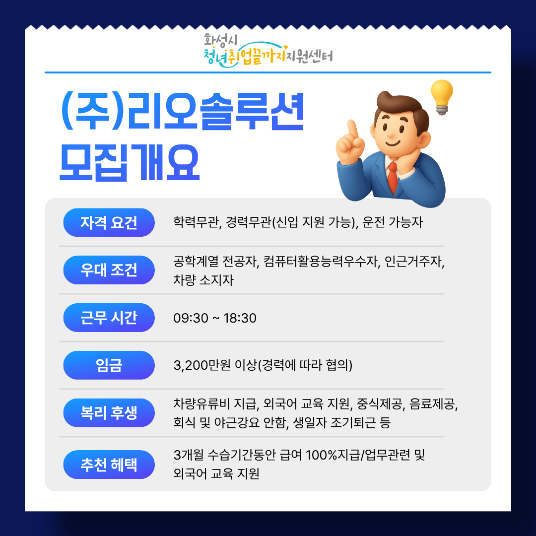 ○ 복리후생: 차량유류비 지급, 외국어 교육 지원, 중식제공, 음료제공, 회식 및 야근강요 안함, 생일자 조기퇴근 등