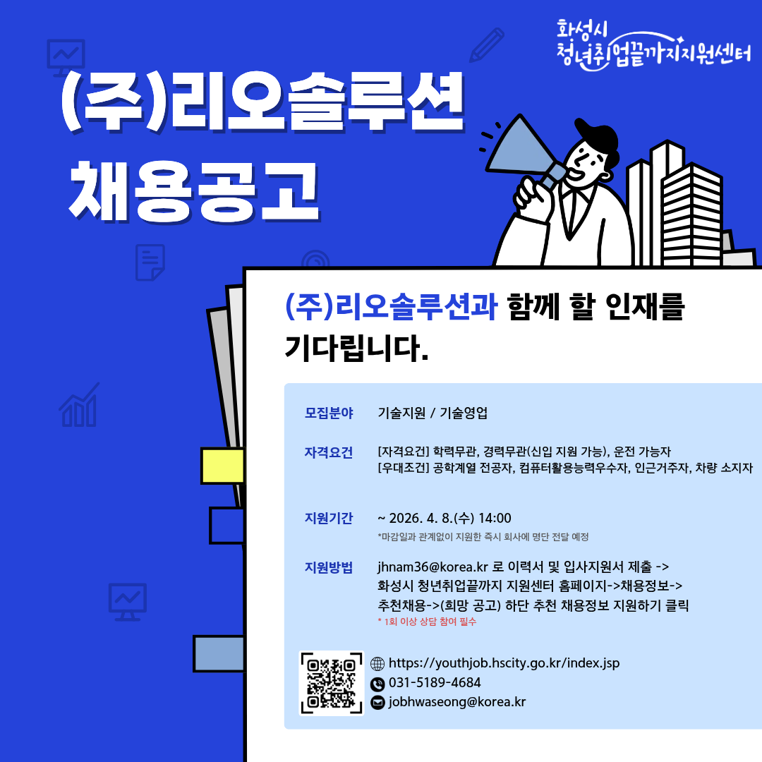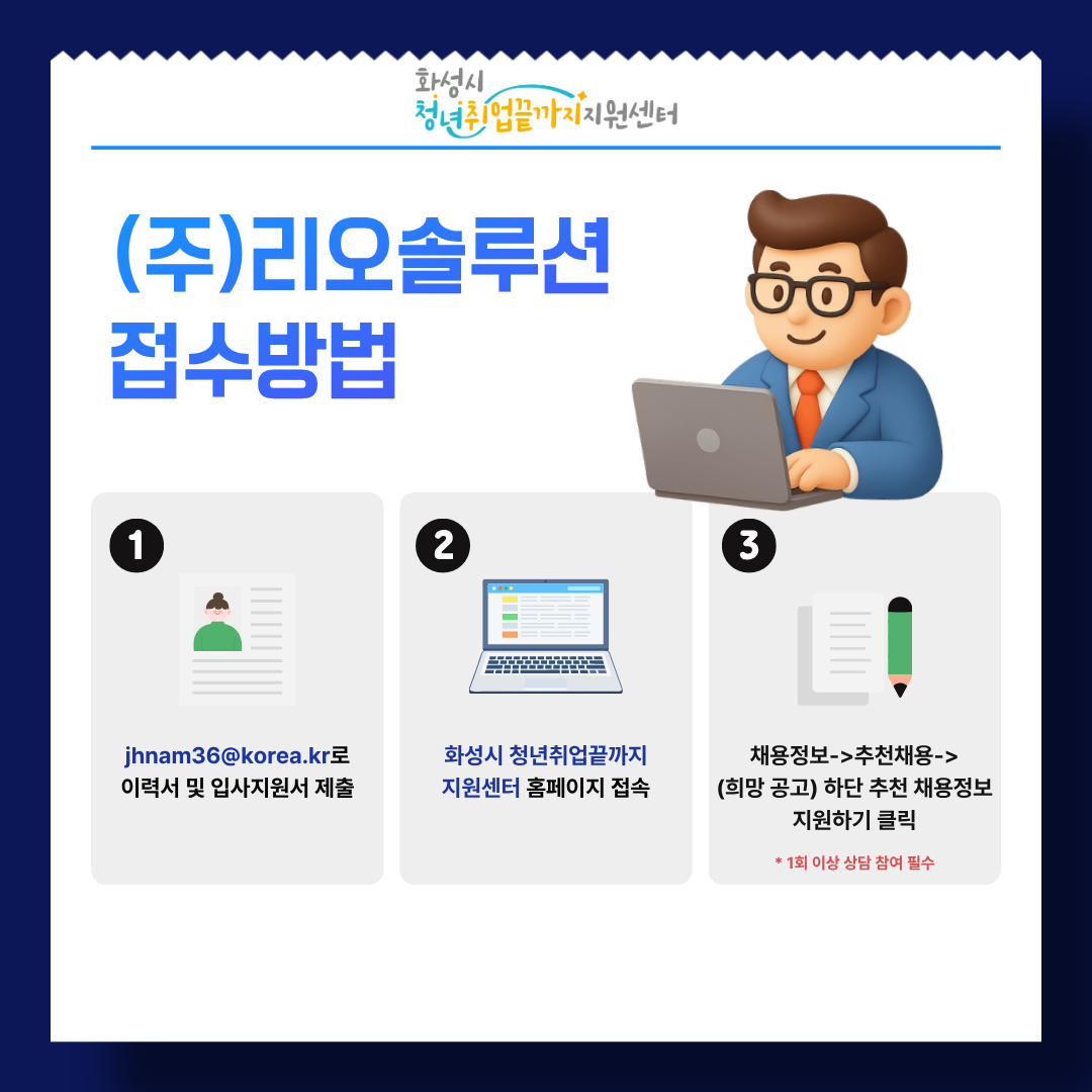 ○ 접수방법: jhnam36@korea.kr 로 이력서 및 입사지원서 제출 -> 화성시 청년취업끝까지 지원센터 홈페이지->채용정보->추천채용->(희망 공고) 하단 추천 채용정보 지원하기 클릭